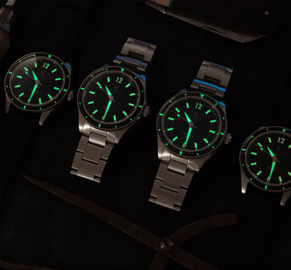 The applied markers, hands, and sapphire bezel are all treated with 8 layers of C3 Swiss Superluminova for ultimate low light legibility.